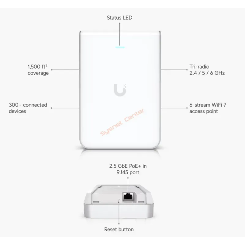 U7-Pro-Wall Ubiquiti UniFi 7 Pro Wall Access Point Wi-Fi 7 (BE) Access Point 3 ความถี่ Tri-Band 2.4/5/6Gbps 10.8Gbps, Port LAN 2.5Gbps รองรับ 300+ Client