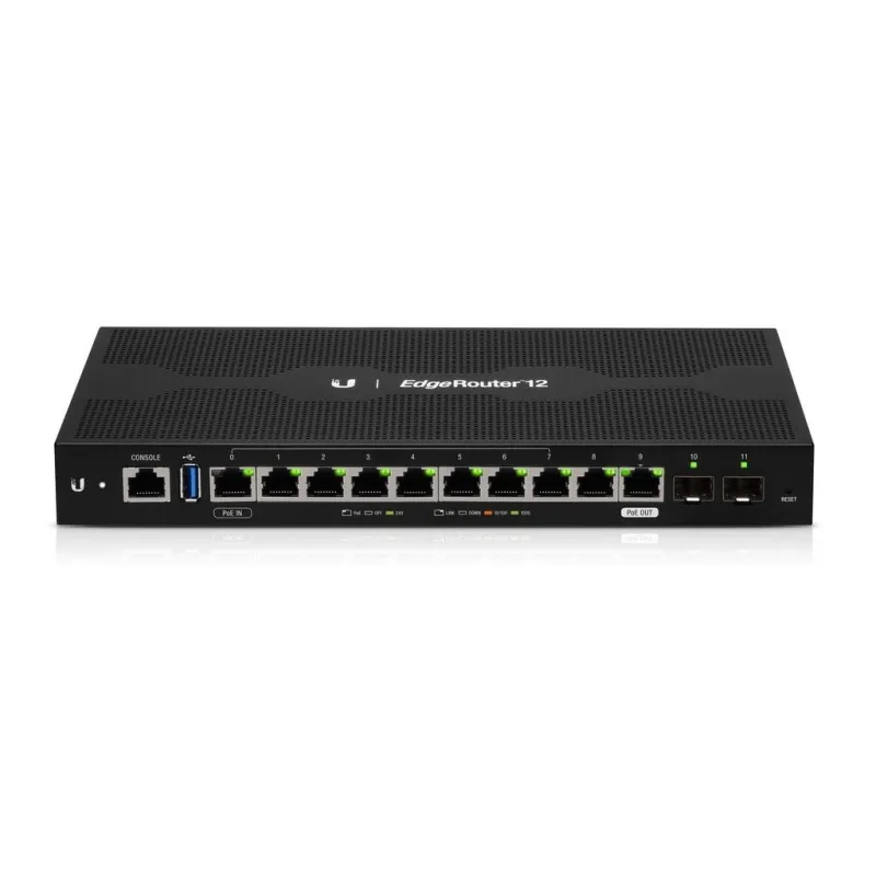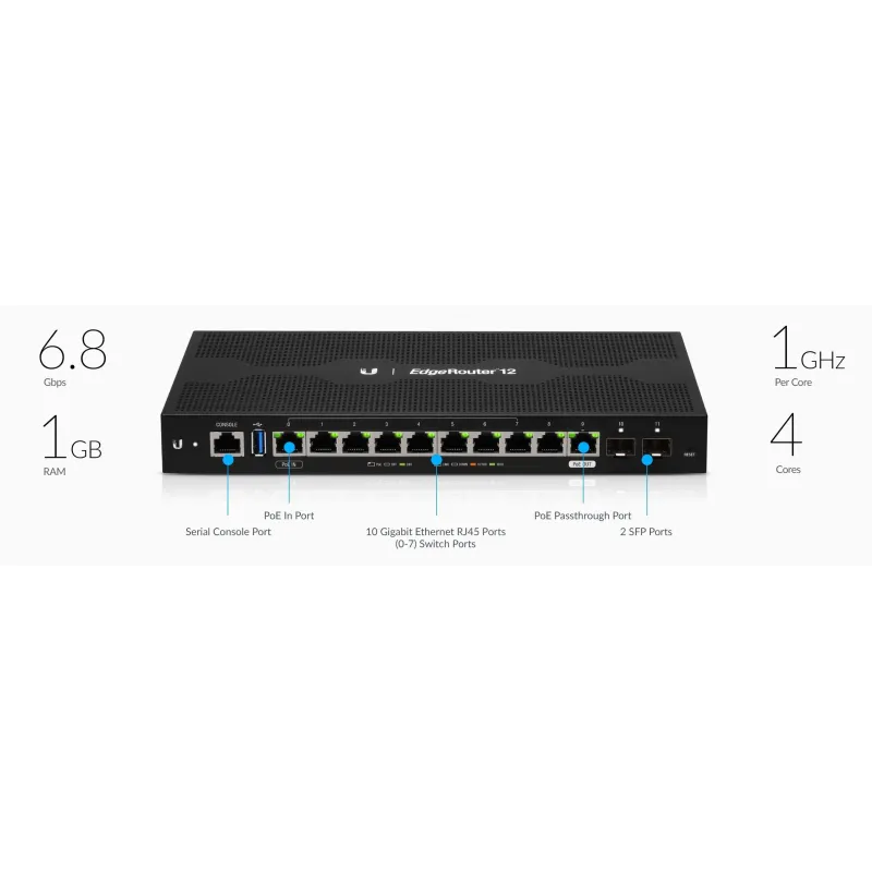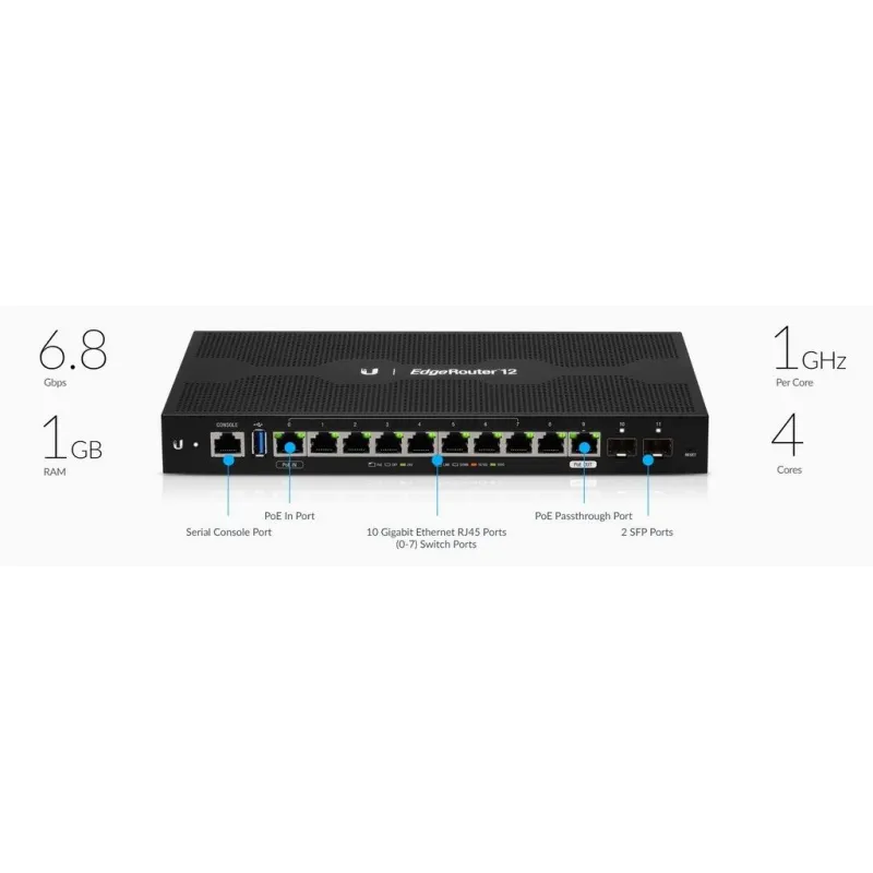Overview | Ubiquiti EdgeRouter 12 (ER-12) Advanced Network Router 12 Port Gigabit, CPU 4 Core 1GHz, Ram 1GB, 3.4Million PPS, 2 SFP Port, POE Passthrough, VPN IPSecs, OpenVPN, PPTP, L2TP |