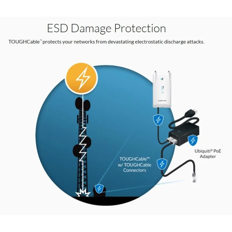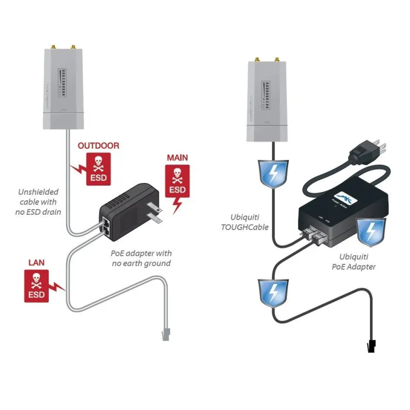 | สายสัญญาณมี Shield จะช่วยป้องกันสัญญาณรบกวน และปัญหาที่เกิดจาก ESD (Electronic Discharge) ไฟฟ้าสถิต ฟ้าผ่า ฟ้าแลบในสถานที่ใกล้เคียง ที่จะมีผลเสียหายกับอุปกรณ์ Access Point ที่ตั้งไว้นอกอาคารในที่สูง อุปกรณ์ Access Point ที่ติดตั้ง ายนอกอาคาร มากกว่า 60% จะเสียหายเนื่องจากไฟฟ้าสถิตสะสม แนะนำให้ติดตั้งสาย Lan และหัว Lan แบบมี Shield รวมถึงต่อกราวด์ |