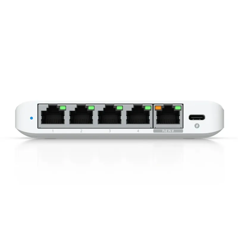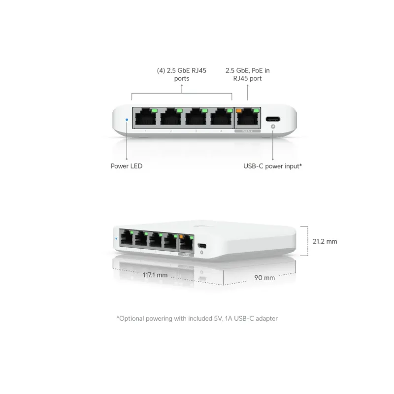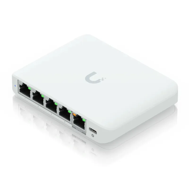 Flex Mini 2.5G Unifi Compact, 5-port 2.5G switch that can be powered with PoE or a USB-C adapter.