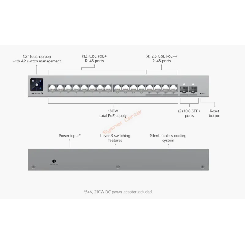 Overview | Ubiquiti Professional Switch USW-Pro-Max-16-POE L2-L3 Managed Gigabit POE Switch 12 Port Gigabit + 4 Port 2.5G/1G, 2 Port SFP+ 10Gbps, จ่ายไฟ POE 802.3af/at/bt 16 Port 180W Layer 3 Feature รองรับการทำ Inter VLAN, Routing, Static Routing, DHCP Server จ่ายไฟ POE มาตรฐาน 802.3af/at/bt 16 Port 180W ควบคุมผ่าน Unifi Software Controller |