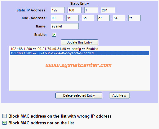 ทีนี้ผมต้องการให้เฉพาะเครื่องที่มีหมายเลข MAC Address ที่กำหนดใน RV042 นี้เท่านั้นที่สามารถใช้ Internet ได้ ส่วนหมายเลข MAC Address อื่นๆที่ Connect เข้ามาในระบบเครือข่ายของเราและไม่ได้อยู่ใน List จะไม่สามารถใช้ Internet ได้ ให้ Click เครื่องหมายถูกที่ Block MAC address not on the list