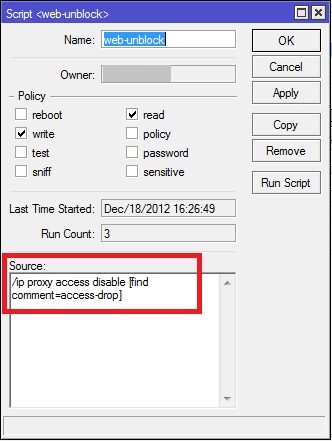 system script add name=block_web policy=read,write source="/ip proxy set enable=yes"