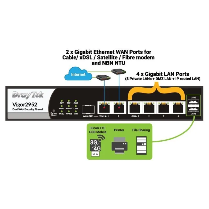 DrayTek Vigor2952 Dual WAN Load-Balance VPN Firewall Router, Internet 2 คู่สาย VPN 200 Tunnels, 60000 NAT Sessions, 500Mbps, QOS, VLAN, รองรับ 4G LTE Modem