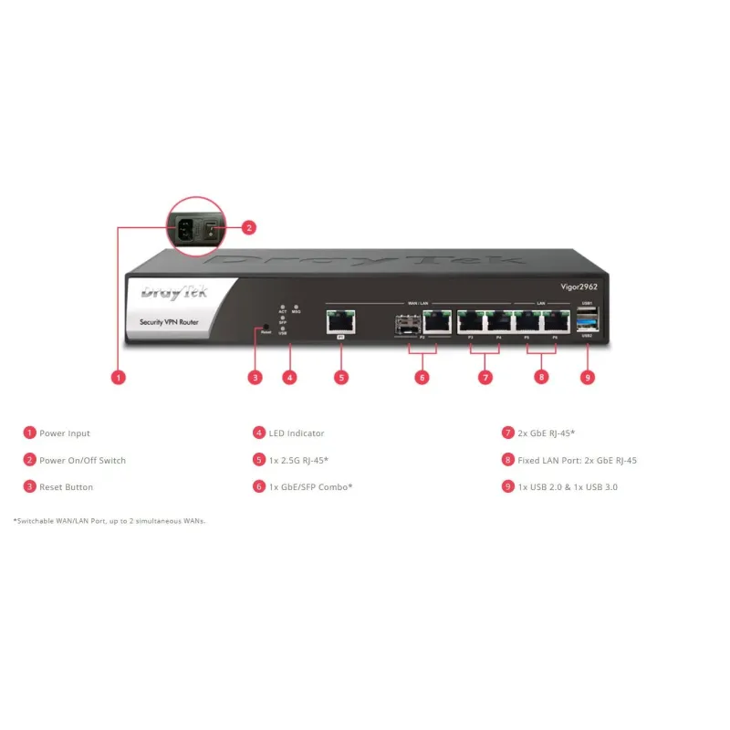 WAN/LAN Switchable Port | 1x 2.5G Ethernet, RJ-451x GbE/SFP Combo2x GbE, RJ-45 *up to 2 simultaneous WANs |