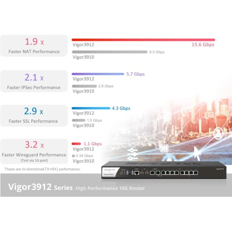 Vigor3912 ถูกออกแบบมาเพื่อเครือข่ายที่ต้องการแบนด์วิธสูง มี CPU Quad-Core 2GHz เพื่อความเร็วในการเชื่อมต่อที่รวดเร็วแม้จะมีอุปกรณ์หลายตัวเชื่อมต่ออยู่ เราเตอร์นี้มีอินเทอร์เฟซ WAN จำนวน 8 พอร์ต ประกอบด้วย 2x 10G SFP+ สำหรับการเชื่อมต่อไฟเบอร์ 2x 2.5G Ethernet และ 4x 1G Ethernet ให้ความเร็ว NAT ที่สูงมาก พอร์ต 1 ถึงพอร์ต 8 สามารถกำหนดค่าได้อย่างอิสระสำหรับ WAN หรือ LAN เพื่อให้ความยืดหยุ่นและเพิ่มประสิทธิภาพของเราเตอร์ รองรับความเร็ว Internet รวมได้สูงสุด 15.6Gbps