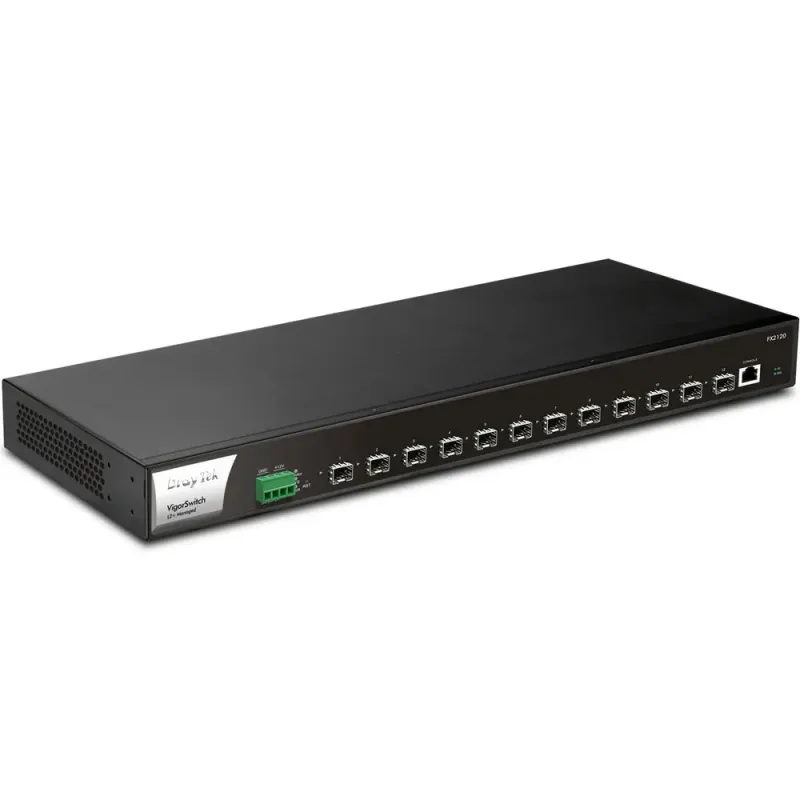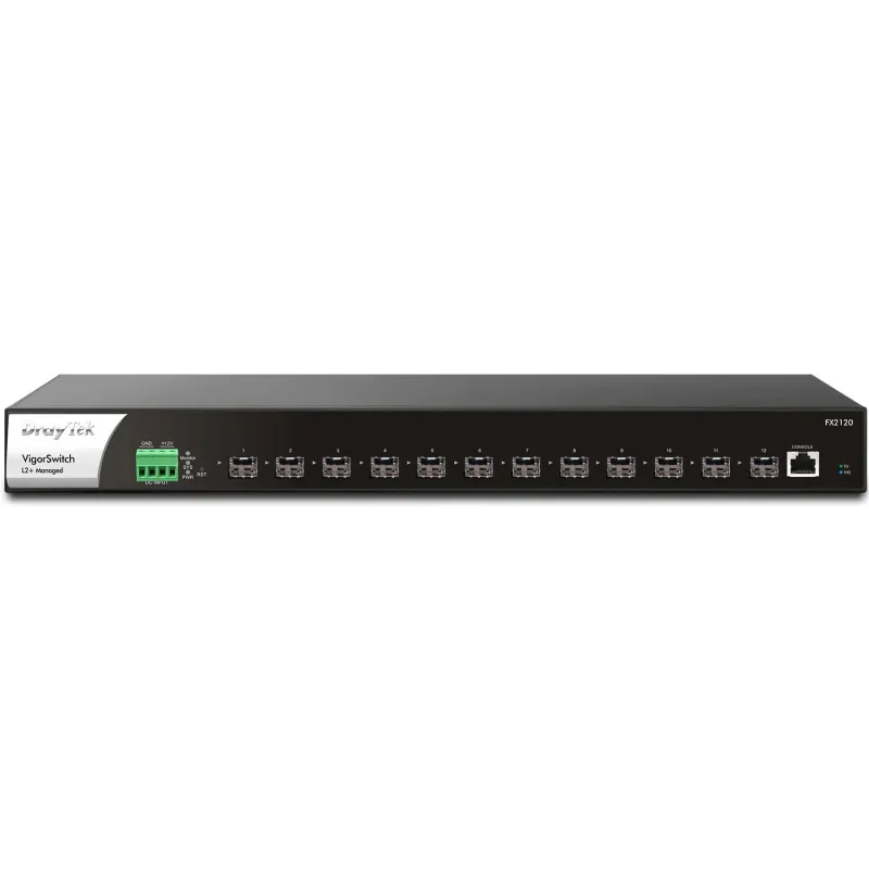 DrayTek VigorSwitch FX2120 is a full 10 Gigabit switch with 12x SFP+ ports for uplink/downlink and 1x console port. It is well-suited for ISP and enterprise network with intensive data transmission.