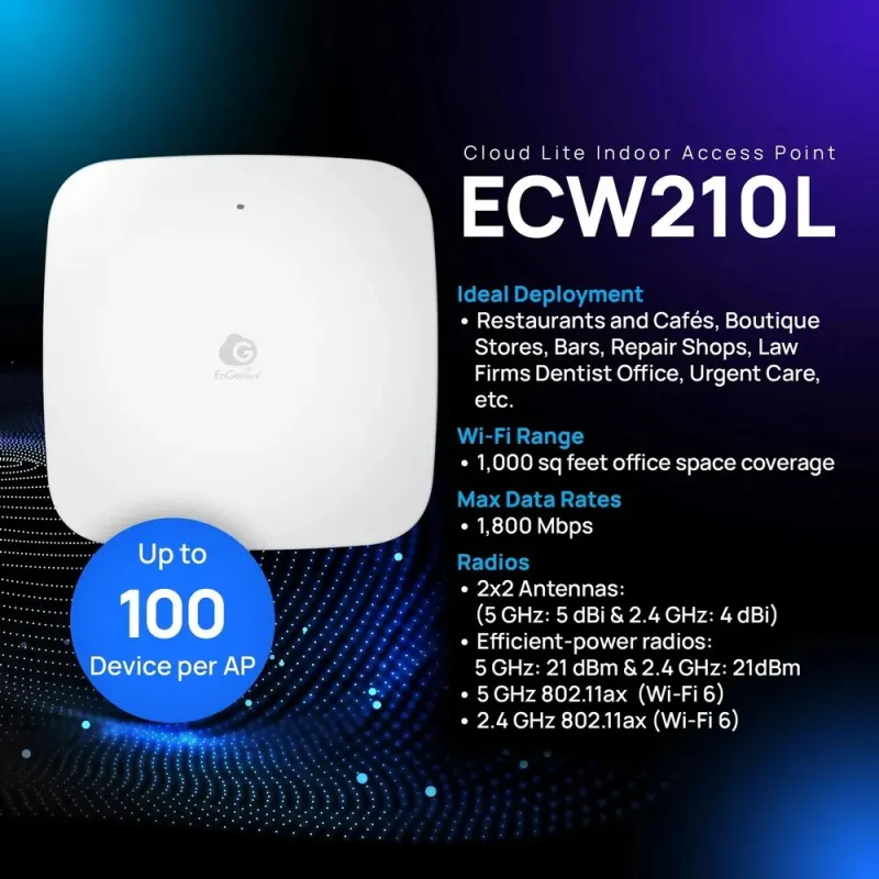 Overview | EnGenius ECW210L Wi-Fi 6 AX3000 2x2 2.97Gbps, Cloud-Managed Access Point, 1 Port Gigabit รองรับ POE มาตรฐาน 802.3af 15.4W, รองรับ Mode Access Point, MESH-WIFI รองรับการ Managged ผ่าน Engenius Cloud Platform (Lite Version) |