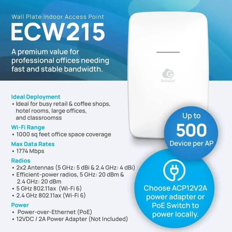 Overview | EnGenius ECW215 Wi-Fi 6 2x2 1800Mbps, Cloud-Managed Wall-Plate Access Point, 2 Port GbE รองรับ POE-Out รองรับการ Managged ผ่าน Engenius Cloud Platform |