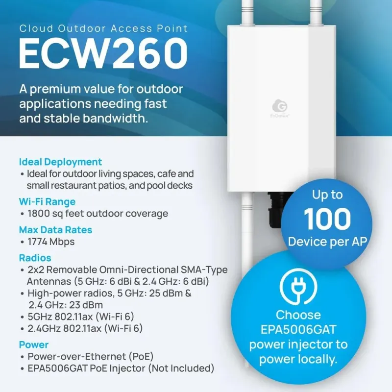Overview | EnGenius ECW260 Cloud Managed AX1800 MU-MIMO Wave 2 Outdoor Wireless Access Point ความเร็วสูงสุด 1.77Gbps เสา 5dBi กันน้ำกันฝุ่นมาตรฐาน IP67, Port LAN 2.5Gbps รองรับการ Managged ผ่าน Engenius Cloud Platform |