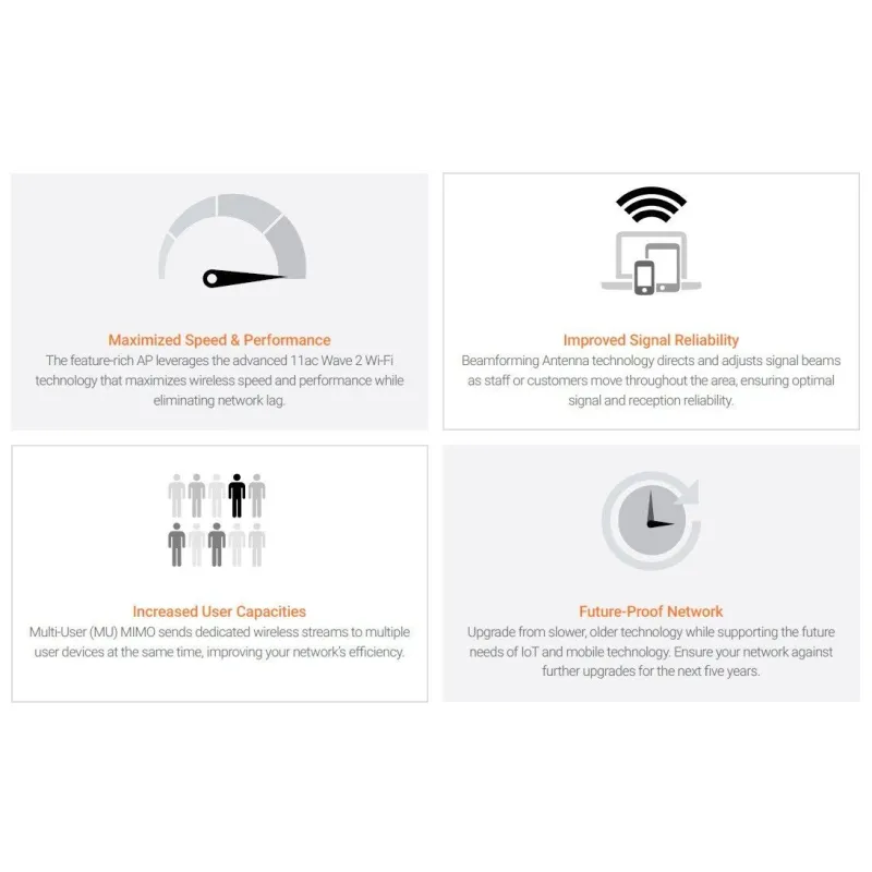 5 GHz - Two (2) Spatial Stream SU-MIMO up to 867 Mbps to individual 2x2 VHT40 client devices