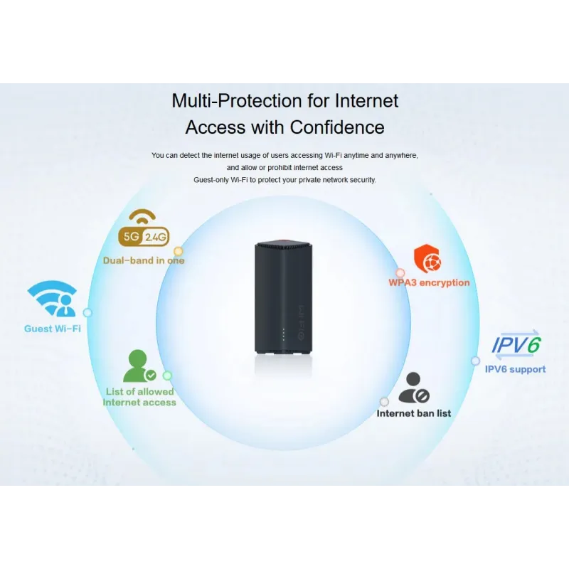 | security features | WPA-PSK/WPA2-PSK//WPA3 encryption Anti-Wi-Fi squatting/anti-attack Firewall, DMZ, DoS attacks |