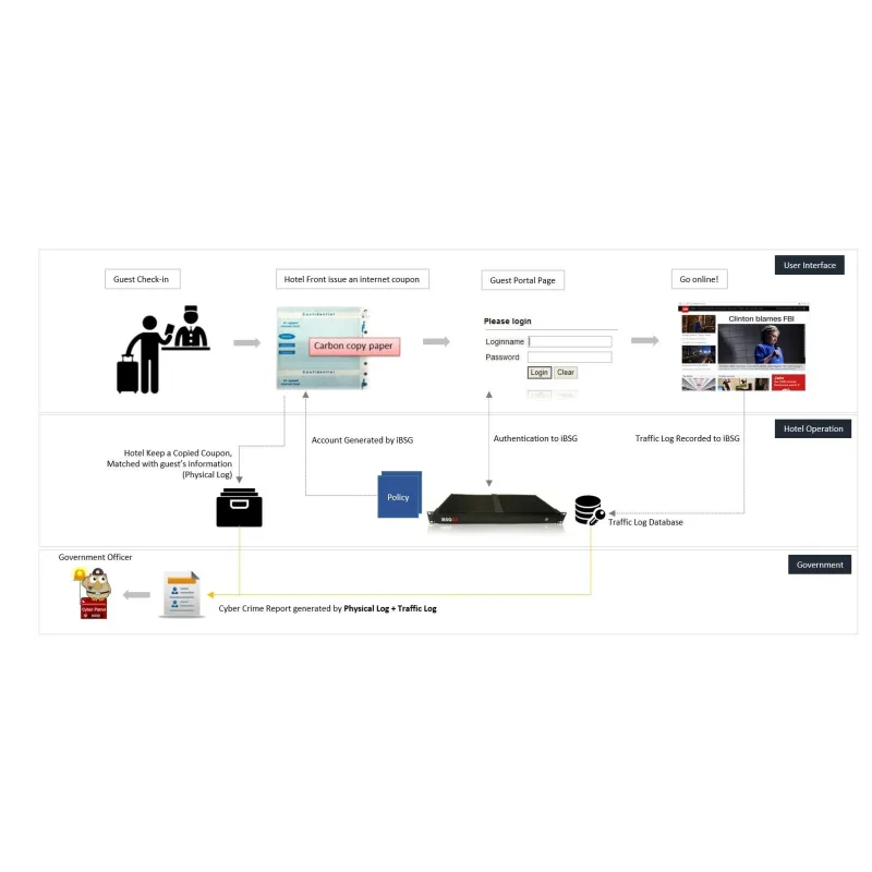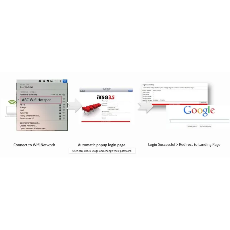 iBSG ใช้เทคนิคในการกำหนดสิทธิ์แบบ Captive Portal ซึ่งถือเป็นรูปแบบที่ได้ความนิยมและผู้ใช้งานคุ้นเคยมากที่สุด โดยเมื่อผู้ใช้งานเชื่อมต่อเครือข่ายและได้รับ IP Address จาก iBSG แล้ว Web Broweser ของเครื่องผู้ใช้จะถูก Re-direct ไปยังหน้า Portal เพื่อให้กรอก Username/Password (User Creditial Account) iBSG ก็จะทำการตรวจสอบกับฐานข้อมูลที่ผู้ดูแลระบบตั้งค่าเอาไว้ หากตรงกัน ผู้ใช้ก็สามารถใช้งานอินเตอร์เน็ตได้ โดยในหน้า Portal นี้ก็ใช้เป็นช่องทางให้ผู้ใช้ตรวจสอบประวัติการใช้งาน เวลาที่เหลือ หรือเปลี่ยนแปลง password ได้อีกด้วย และ Admin ระบบ สามารถแก้ไขหน้าจอ Portal นี้ได้ตามต้องการ เช่นใส่ Logo ร้าน โรงแรม แจ้งรายละเอียดการติดต่อ