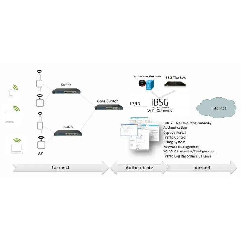 โดย iBSG จะถูกติดตั้งขวางระหว่างผู้ใช้ก่อนที่จะเข้าถึงอินเตอร์เน็ตได้ โดย iBSG-Mini สามารถรองรับเครือข่าย (Access Network) ทั้งแบบที่เป็น Ethernet (Layer 2) หรือ IP Network (Layer 3) (License Enterprise) ได้