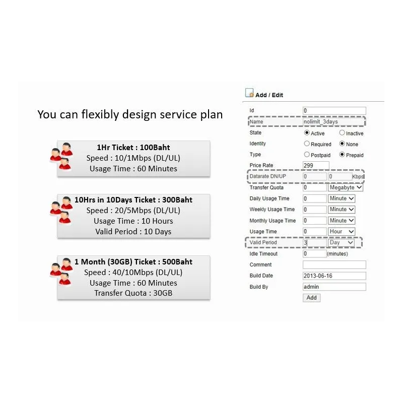 ผู้ให้บริการสามารถออกแบบรูปการให้บริการได้อย่างหลากหลาย โดยสามารถกำหนดลักษณะการให้บริการให้เป็นได้ทั้งแบบ Prepaid (ซื้อ Account เป็นครั้งๆ ใช้แล้วทิ้ง) หรือ Postpaid (เก็บค่าบริการเป็นรายเดือน) ซึ่งสามารถกำหนดออกมาเป็นรูปแบบ Profile (หรือเรียกกันทั่วไปว่่า Package) โดยแต่ละ Profile จะสามารถกำหนดความเร็วสูงสุดในการใช้งานอัพโหลด (Upload) หรือ ดาวน์โหลด (Download) ระยะเวลาที่สามารถใช้งานได้ ต่อวัน ต่อเดือน จำนวนปริมาณข้อมูลที่ใช้งาน รวมไปถึงกำหนดระยะเวลาที่จะสามารถใช้งานได้หลัง login เข้าใช้งานเป็นต้น เช่น เมื่อครบ 7 วันจากการ Login เข้าใช้งานครั้งแรก จะหมดอายุ ดังนั้น iBSG จึงสามารถรองรับการให้บริการอินเตอร์เน็ตในอพาร์ทเมนต์ โรงแรม โรงเรียน หรือแม้กระทั่งออฟฟิตทั่วไปได้เป็นอย่างดี