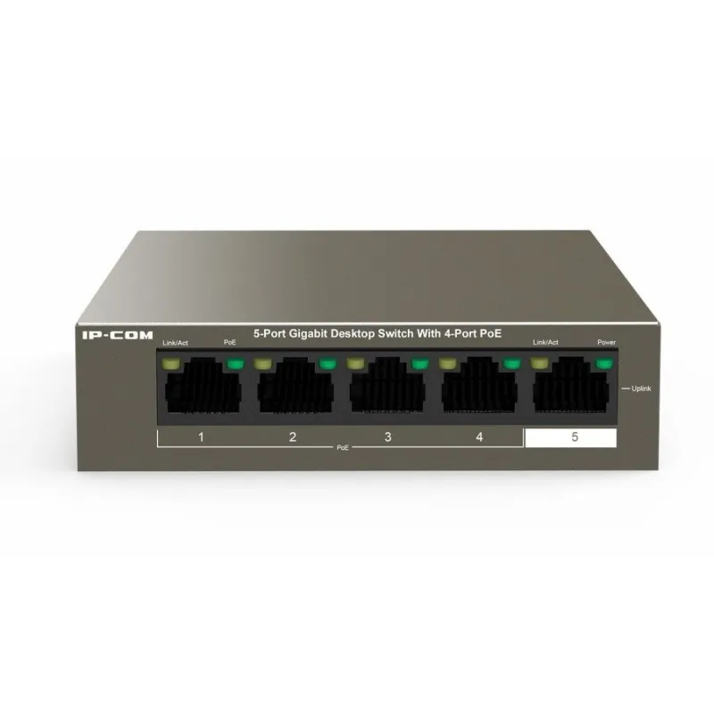 IP-COM G1105P-4-63W POE Switch Giabit 5 Port Desktop ความเร็ว Gigabit จ่ายไฟ POE มาตรฐาน 802.3af/at ได้ 4 Port สูงสุด 58W ทำ Port Isolate ง่ายๆ ด้วยการเลื่อน DIB Switch