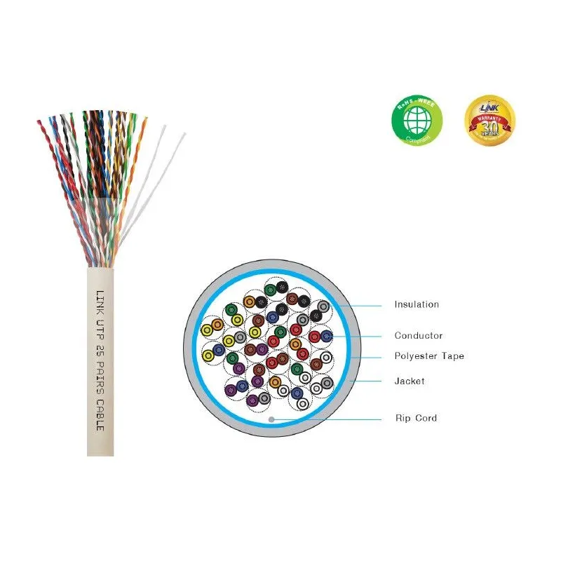 Overview | Link US-9055E สายนำสัญญาณ UTP มาตรฐาน CAT5E (350 MHz) ใช้ภายในอาคาร มี 25 คู่สายสำหรับการเชื่อมต่อเครือข่ายจำนวนมากในสายเดียว สีขาว ลวดทองแดงขนาด 24AWG, รองรับความเร็ว 10/100/1000 Mbps ความยาว 305 เมตร/กล่อง |