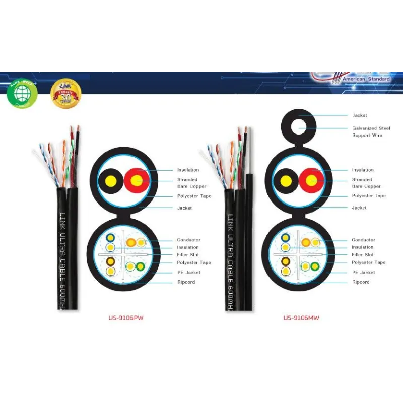 Link US-9106PW สาย LAN ภายนอก Outdoor CAT6 สีดำ 100 เมตร แบบมีสายไฟในตัว CAT 6 UTP,PE OUTDOOR w/Power wire Black 100M.*/Reel in Bx. รองรับความเร็ว Gigabit