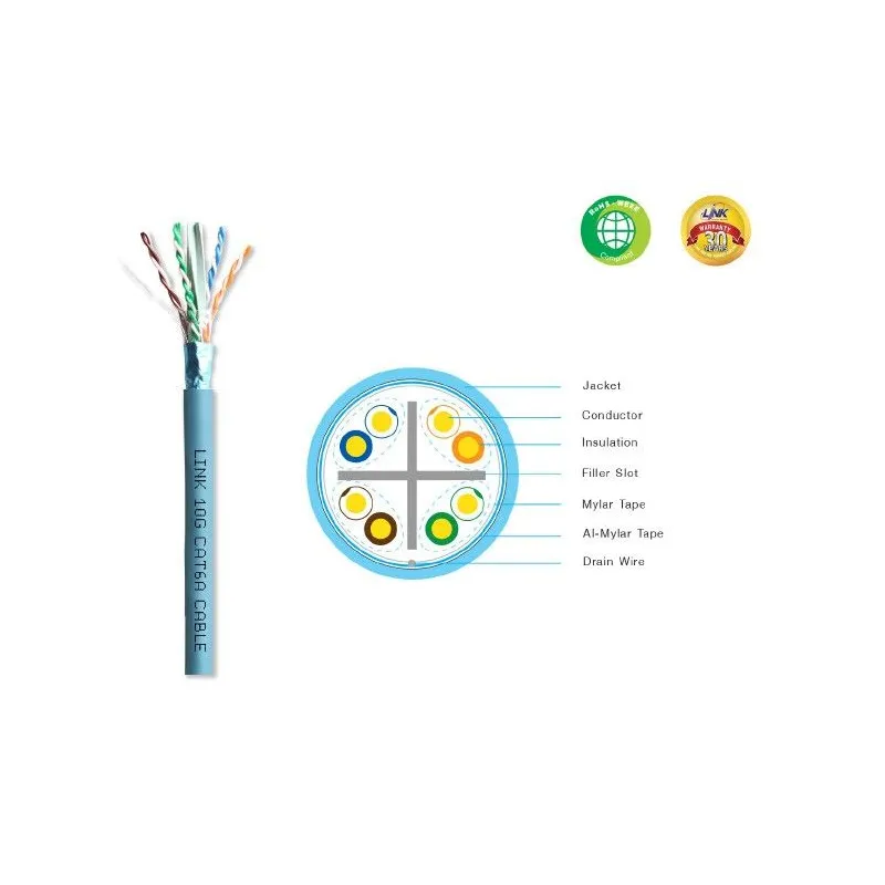 | วัสดุ | เปลือกหุ้มพีวีซี LSZH สีฟ้า Shield ฟอยล์หุ้ม Aluminum Mylar Tape กันสายภายใน Filler Slot เป็น FRPE สายภายในเป็นลวดทองแดงขนาดตัวนำไฟฟ้า 23AWG (Solid Bare Copper) |