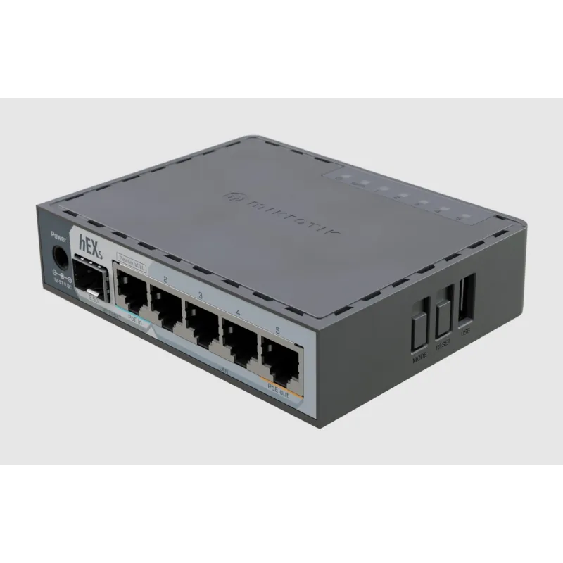 Mikrotik Router hEX S (E60iUG) 2025 ROS Lv4, CPU ARM EN7562CT 950MHz RAM 512MB, 5 Port Gigabit, 1 SFP 2.5G, 1 USB รองรับ POE in, POE out