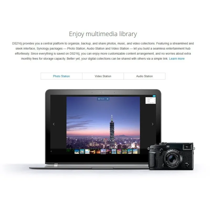 Overview | Sysnology DS216J อุปกรณ์จัดเก็บข้อมูล NAS (Network Attatch Storage) ขนาด 2 Bay รองรับ Harddisk ได้ 2 ลูก สูงสุด 16TB (8TB x 2) สำหรับ Backup ข้อมูลและแชร์์ข้อมูลผ่านระบบเครือข่าย รองรับการติดตั้ง Software ได้หลากหลายเช่น Download Bittorent, iTune Server, Media Straming, Syslog Server, AppServer เหมาะสำหรับใช้ในหน่วยงาน หรือองค์กรที่ต้องการอุปกรณ์ NAS ที่มีความเสถียรภาพสูง |