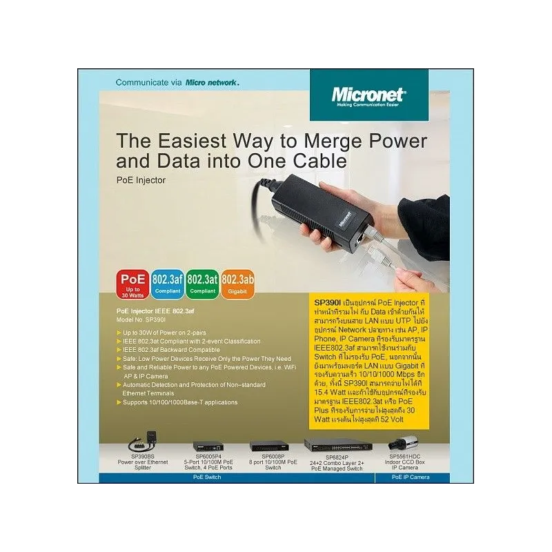 Micronet SP390I Power Over Ethernet (POE) อุปกรณ์ฝากไฟไปกับสาย Lan มาตรฐาน 802.3at/af รองรับความเร็ว Gigabit กำลังไฟ 30W ใช้ร่วมกับสาย Lan ได้ระยะถึง 100 เมตร