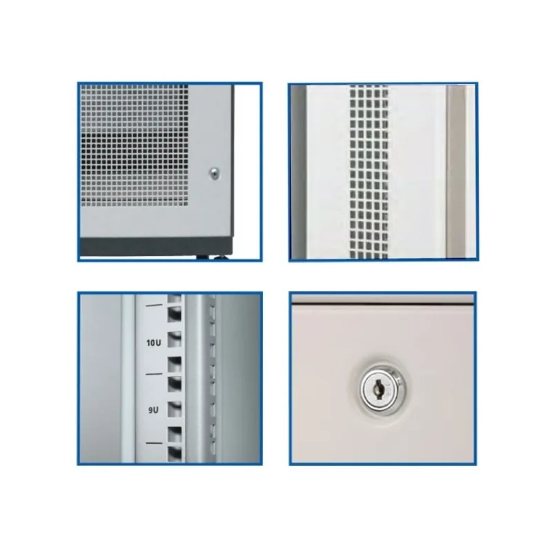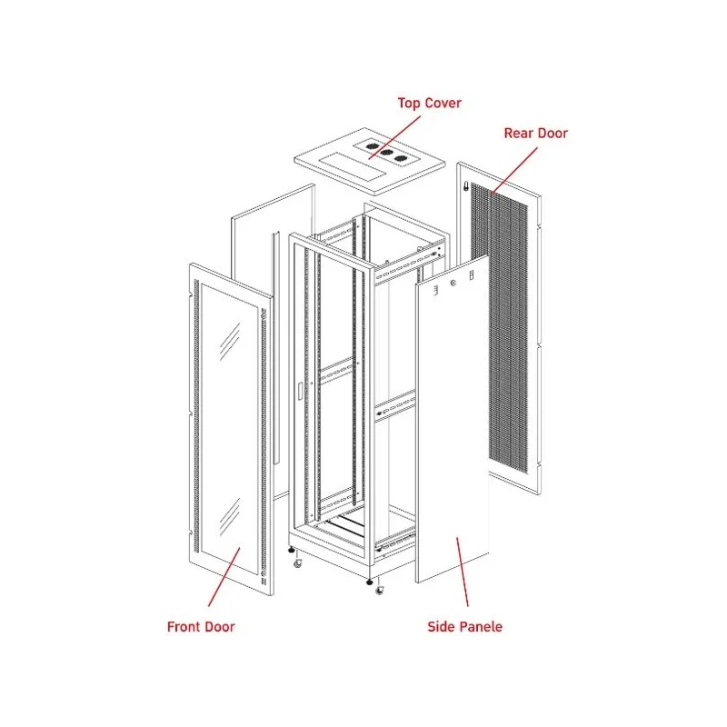 | ส่วนประกอบ | โครงสร้าง (Structure) ติดตั้งเป็นแบบลิ่มล็อคเพิ่มความแข็งแรงของตู้แร็ค เสาคานยึดอุปกรณ์ (Mounting Pole) จำนวน 4 ต้น เป็นแบบรูปตัวซี (C - Shape) ให้ความแข็งแรงสูง ที่ขอบเสาคานทั้ง 2 ด้านมีรูใช้ยึดอุปกรณ์ (Mounting Hole) แบบสี่เหลี่ยมขนาด 10 x 10 มม. พร้อมป้ายบอกระยะความสูงของ U โดยเสาคานยึดอุปกรณ์สามารถปรับเลื่อนตำแหน่งได้ เพื่อให้ความสะดวกในการติดตั้งอุปกรณ์ภายในตู้แร็ค ประตูหน้า (Front Door) ส่วนกลางเป็น Plastic Acrylic สีชาหนา 5 มม. กว้าง 38 ซม. *ความสูงเปลี่ยนตามความสูงของตู้แร็ค, ด้านซ้ายและขวาประตูหน้าเจาะรูระบายอากาศแนวตั้ง ขอบประตูมียางรองกันกระแทกสีเทาตลอดแนว ด้านซ้ายประตูหน้ามีกุณแจ Security Locks ด้วย Master Key แบบ Cam Lock ประตูหลัง (Rear Door) เป็นเหล็กมีช่องระบายอากาศ 50% เจาะรูเต็มแผ่น ยึดฝาประตูเป็นรูปตัว T ให้ความแข้งแรงของบานประตู, ขอบประตูมียางรองกันกระแทกสีเทาตลอดแนว และมีกุณแจ Security Locks ด้วย Master Key เหมือนประตูหน้า บานพับประตู (Hinges) เป็นพลาสติกพีวีซี ชนิดเหนียวพิเศษ 3 ชิ้น ไม่เป็นสนิมมีความแข็งแรงคนทน รองรับน้ำหนักได้มากและขณะเปิดปิดก็ไม่ทำให้เกิดเสียงรบกวน เราสามารถปรับเปลี่ยนทิศทางการเปิดปิดประตูหน้าให้มาทางซ้ายหรือขวาของตู้แร็คได้ ฝาด้านข้าง (Slide Panels) ทั้ง 2 ด้าน มีมือจับพร้อมกลอนสลักสปริง (Slide Latch) ด้านละ 2 ชุด ติดอยู่ด้านบนเพื่อใช้ถอดและใส่ฝาข้างและมีกุณแจ Security Locks ด้วย Master Key แบบ Cam Lock เหมือนประตูหน้า ฝาบนของตู้ (Roof Cover) รองรับการติดพัดลมระบายอากาศได้สูงสุด 6 ตัว โดยเลือกติดแบบพัดลมเดี่ยวหรือแบบชุดพัดลม 2-3 ตัวได้ และสามารถถอดเปลี่ยนฝาบนของตู้ (Roof Cover) เป็นแบบยกสูง (Vented Raised Roof Cover) ได้ ฐานตู้ (Base) ออกแบบเพื่อให้ความแข็งแรงและการรับน้ำหนักได้มาก โดยด้านล่างของฐานตู้แร็คเป็นแบบ 3 Part Plinth มีช่องร้อยสายสัญญาณและสายไฟฟ้าแบบบานสไลด์พร้อมฟองน้ำสีเทา (Slide Shutter) สามารถปรับขยายได้ และสามารถติดพัดลมระบายอากาศด้านล่าง ขาตั้ง (Pedestal) ยึดติดกับฐานตู้สามารถปรับขึ้น - ลงได้ โดยฐานขาตั้งทั้ง 4 ขา ทำจากวัสดุ ABS สีดำ เพื่อป้องกันไฟฟ้าสถิตและป้องกันการรั่วของกระแสไฟฟ้าลงพื้นและสามารถปรับเอียงตามความพื้นที่ได้อย่างอิสระ 180 องศา (Aligns onuneven surface) ล้อเลื่อน (Castor) แบบหมุนได้ 360 องศา (Swivel Plate) สะดวกต่อการเคลื่อนย้าย วัสดุทำจาก Nylon Six สีดำ ขนาดเส้นผ่านศูนย์กลาง 50 มม. สามารถรับน้ำหนัก (Static load) ได้ 150 กิโลกรัม ต่อ 1 ล้อเลื่อน ตู้แร็คเป็นสี Two-Tone (ขาวเทา-เทาเข้ม) ใช้เทคโนโลยีการพ่นและอบสีแบบ Electro Static Power Coatings ให้ความเนียนเรียบและการยึดเกาะของสีที่คงทน ชุดน็อตสกรู (Screw Set) ประกอบด้วยน๊อตสกรูตัวผู้ (Screw) แป้นยึดน๊อตตัวเมีย (Captive Nut) และแหวนรองพลาสติก (Plastic Washer) โดยสกรูแล