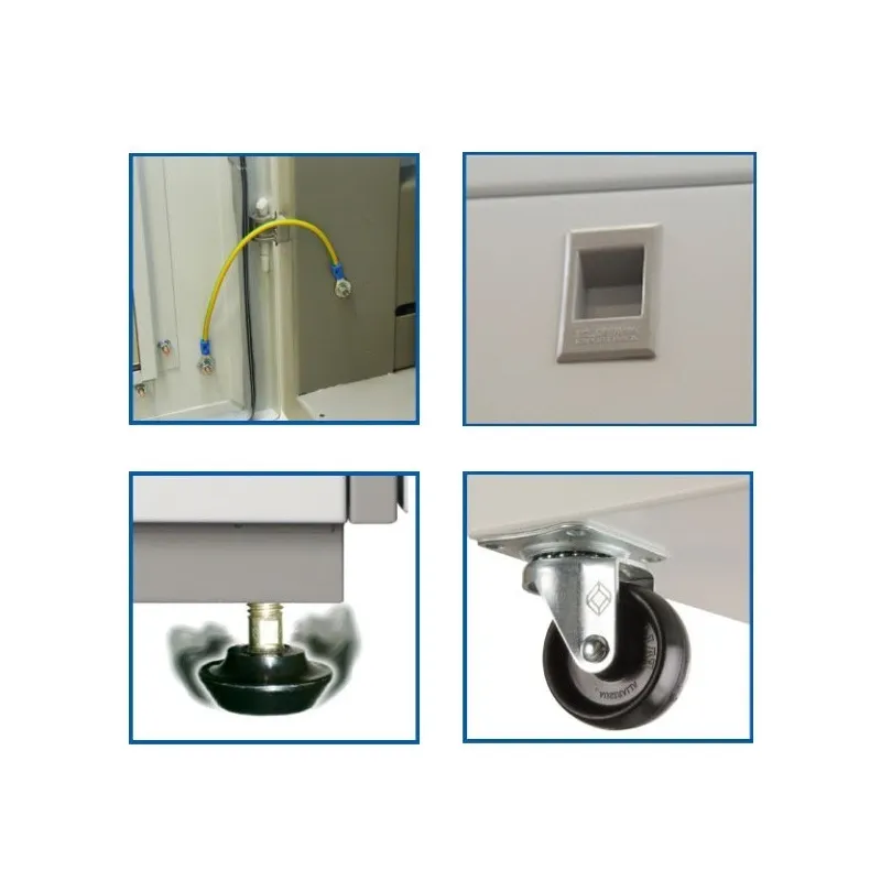 | วัสดุ | ผลิตขึ้นจากเหล็กแผ่นเคลือบสังกะสีแบบไฟฟ้า (Electro Galvanize Sheet Steel) หนา 1.5 มม. เสายึดอุปกรณ์, โครงตู้และฐานตู้ เหล็กหนา 2 มม. โดยฐานตู้แร็คส่วนที่ยึดล้อเลื่อนและขาตั้งใช้เหล็กหนา 3 มม. เหล็กกันสนิม 100% |