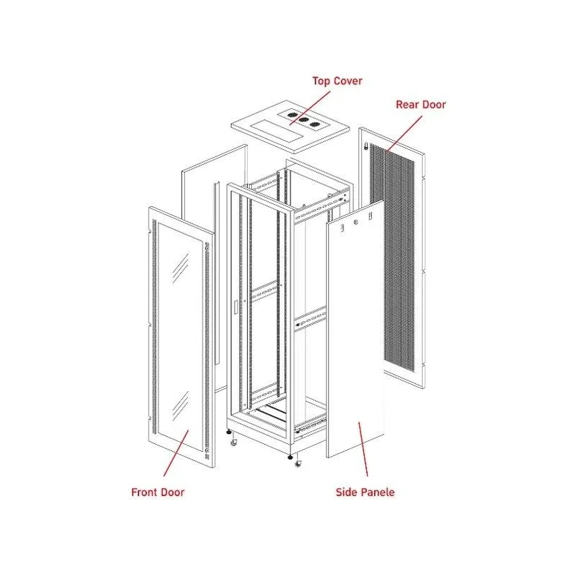 | ส่วนประกอบ | โครงสร้าง (Structure) ติดตั้งเป็นแบบลิ่มล็อคเพิ่มความแข็งแรงของตู้แร็ค เสาคานยึดอุปกรณ์ (Mounting Pole) จำนวน 4 ต้น เป็นแบบรูปตัวซี (C - Shape) ให้ความแข็งแรงสูง ที่ขอบเสาคานทั้ง 2 ด้านมีรูใช้ยึดอุปกรณ์ (Mounting Hole) แบบสี่เหลี่ยมขนาด 10 x 10 มม. พร้อมป้ายบอกระยะความสูงของ U โดยเสาคานยึดอุปกรณ์สามารถปรับเลื่อนตำแหน่งได้ เพื่อให้ความสะดวกในการติดตั้งอุปกรณ์ภายในตู้แร็ค ประตูหน้า (Front Door) ส่วนกลางเป็น Plastic Acrylic สีชาหนา 5 มม. กว้าง 38 ซม. *ความสูงเปลี่ยนตามความสูงของตู้แร็ค, ด้านซ้ายและขวาประตูหน้าเจาะรูระบายอากาศแนวตั้ง ขอบประตูมียางรองกันกระแทกสีเทาตลอดแนว ด้านซ้ายประตูหน้ามีกุณแจ Security Locks ด้วย Master Key แบบ Cam Lock ประตูหลัง (Rear Door) เป็นเหล็กมีช่องระบายอากาศ 50% เจาะรูเต็มแผ่น ยึดฝาประตูเป็นรูปตัว T ให้ความแข้งแรงของบานประตู, ขอบประตูมียางรองกันกระแทกสีเทาตลอดแนว และมีกุณแจ Security Locks ด้วย Master Key เหมือนประตูหน้า บานพับประตู (Hinges) เป็นพลาสติกพีวีซี ชนิดเหนียวพิเศษ 3 ชิ้น ไม่เป็นสนิมมีความแข็งแรงคนทน รองรับน้ำหนักได้มากและขณะเปิดปิดก็ไม่ทำให้เกิดเสียงรบกวน เราสามารถปรับเปลี่ยนทิศทางการเปิดปิดประตูหน้าให้มาทางซ้ายหรือขวาของตู้แร็คได้ ฝาด้านข้าง (Slide Panels) ทั้ง 2 ด้าน มีมือจับพร้อมกลอนสลักสปริง (Slide Latch) ด้านละ 2 ชุด ติดอยู่ด้านบนเพื่อใช้ถอดและใส่ฝาข้างและมีกุณแจ Security Locks ด้วย Master Key แบบ Cam Lock เหมือนประตูหน้า ฝาบนของตู้ (Roof Cover) รองรับการติดพัดลมระบายอากาศได้สูงสุด 6 ตัว โดยเลือกติดแบบพัดลมเดี่ยวหรือแบบชุดพัดลม 2-3 ตัวได้ และสามารถถอดเปลี่ยนฝาบนของตู้ (Roof Cover) เป็นแบบยกสูง (Vented Raised Roof Cover) ได้ ฐานตู้ (Base) ออกแบบเพื่อให้ความแข็งแรงและการรับน้ำหนักได้มาก โดยด้านล่างของฐานตู้แร็คเป็นแบบ 3 Part Plinth มีช่องร้อยสายสัญญาณและสายไฟฟ้าแบบบานสไลด์พร้อมฟองน้ำสีเทา (Slide Shutter) สามารถปรับขยายได้ และสามารถติดพัดลมระบายอากาศด้านล่าง ขาตั้ง (Pedestal) ยึดติดกับฐานตู้สามารถปรับขึ้น - ลงได้ โดยฐานขาตั้งทั้ง 4 ขา ทำจากวัสดุ ABS สีดำ เพื่อป้องกันไฟฟ้าสถิตและป้องกันการรั่วของกระแสไฟฟ้าลงพื้นและสามารถปรับเอียงตามความพื้นที่ได้อย่างอิสระ 180 องศา (Aligns onuneven surface) ล้อเลื่อน (Castor) แบบหมุนได้ 360 องศา (Swivel Plate) สะดวกต่อการเคลื่อนย้าย วัสดุทำจาก Nylon Six สีดำ ขนาดเส้นผ่านศูนย์กลาง 50 มม. สามารถรับน้ำหนัก (Static load) ได้ 150 กิโลกรัม ต่อ 1 ล้อเลื่อน ตู้แร็คเป็นสี Two-Tone (ขาวเทา-เทาเข้ม) ใช้เทคโนโลยีการพ่นและอบสีแบบ Electro Static Power Coatings ให้ความเนียนเรียบและการยึดเกาะของสีที่คงทน ชุดน็อตสกรู (Screw Set) ประกอบด้วยน๊อตสกรูตัวผู้ (Screw) แป้นยึดน๊อตตัวเมีย (Captive Nut) และแหวนรองพลาสติก (Plastic Washer) โดยสกรูแล