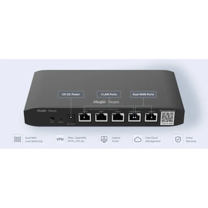 Overview | Reyee RG-EG105G-V3 Cloud Managed Router 2 Wan, 4 Port Gigabit รองรับ 100 Concurrent users, Throughput 600Mbps, IPSec VPN 8 Tunnels, ทำ Captive Portal รองรับการ Managed และ Monitor by Ruijie Cloud มาพร้อม Cloud License ตลอดชีพ ** ข้อแตกต่างระหว่าง RG-EG105G V2 และ V3 |