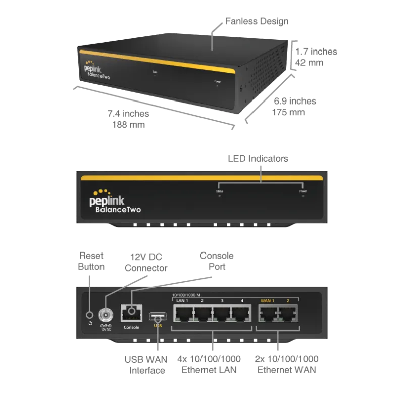 Peplink Balance Two, SD-WAN LoadBalance VPN Router 2Wan, รองรับ Internet 1Gbps, VPN Throughput 150Mbps, รองรับ 4G LTE USB Dongle สำหรับเชื่อมต่อเครือข่ายระหว่างสาขาที่ต้องการความเสถียรสูงมาก