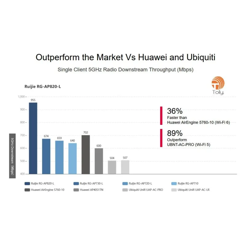 Since Wi-Fi 6 is quite a new protocol, a large portion of mobile devices on the market can only support Wi-Fi 5. Tolly engineers used twelve Wi-Fi 5 clients to evaluate whether Ruijie's new Wi-Fi 6 access point provides improvement over Ruijie's Wi-Fi 5 access point with the Wi-Fi 5 clients. Results show that Ruijie RG-AP820-L (Wi-Fi 6 AP) provide 65% higher total throughput to the twelve W-Fi 5 clients than the Ruijie RG-AP720-L (W-Fi AP). See Figure 6 for detailed results.