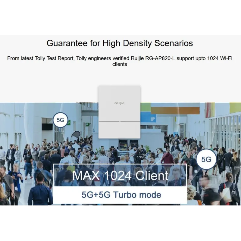 Ruijie RG-AP880-I, RG-AP840-I and RG-AP820-L each provides one 2.4GHz radio and one 5GHz radio. Tolly engineers verified that Ruijie RG-AP880-I, RG-AP840-I and RG-AP820-L each supported 1,024 Wi-Fi clients/users on one AP with 512 Wi-Fi clients/users on each radio.
