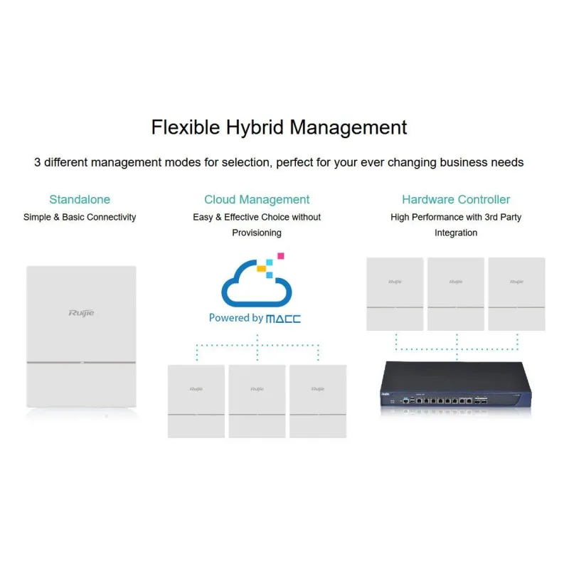 FAT/FIT/MACC mode switching | Factory default firmware supports FAT (standalone) or FIT mode (WS controller) or MACC mode (Ruijie MACC-Base or Ruijie Cloud) management |