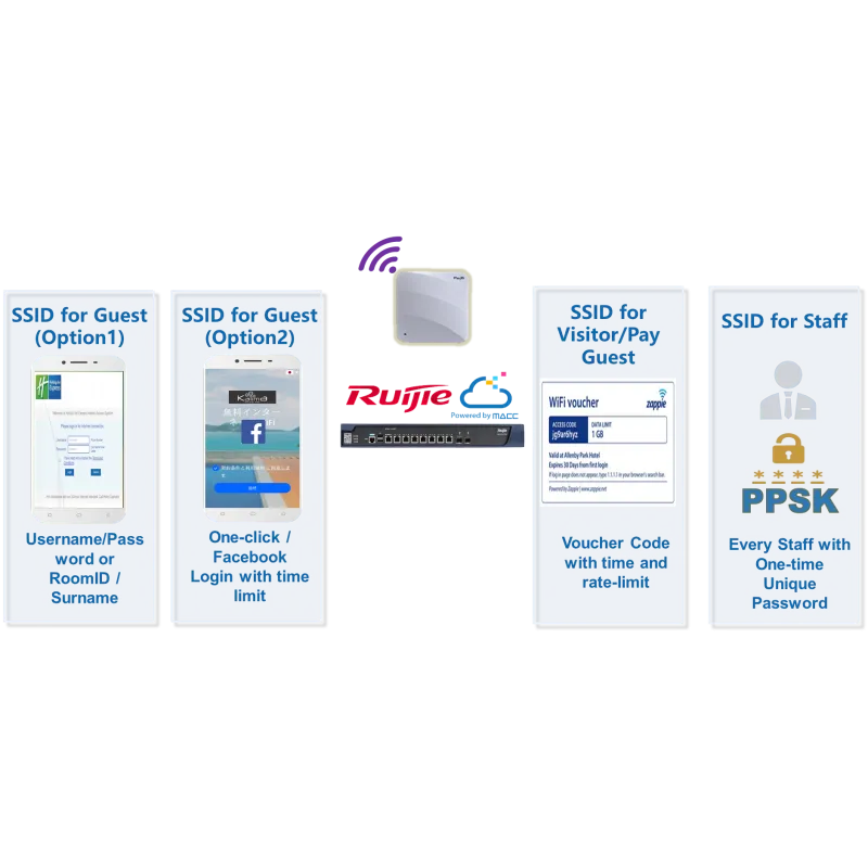 Portal Authentication Type | Username/Password Auth (Local, Windows-based AD/LDAP Integration) One-click Authentication; Guest Voucher (Ruijie Cloud required); |