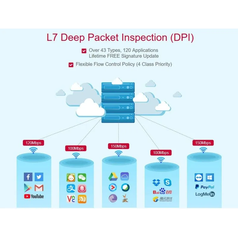 Application Visibility | Support self-developed 43 types of applications / more than 120 application features, customizable protocol identification: |