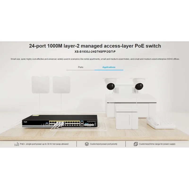 Overview | Ruijie XS-S1930J-24GT4SFP/2GT-P L2-Managed Gigabit POE Switch 24 Port, 4 Port SFP รองรับ VLAN, LACP, IGMP Snooping รองรับ Managed ผ่าน Ruijie Cloud จ่ายไฟ POE มาตรฐาน 802.3af/at 24 Port กำลังไฟสูงสุด 370W |