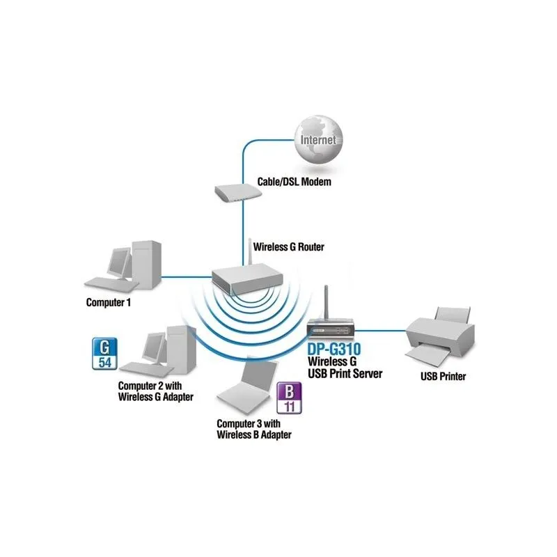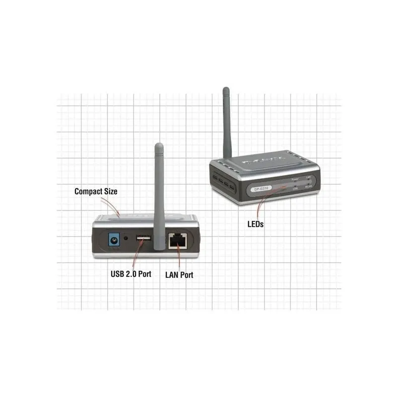 อุปกรณ์ D-Link DP-G310 Wireless Print Server ความเร็ว 54Mbps มาพร้อม 1 Port 10/100Mbps สำหรับเชื่อมต่อกับระบบเครือข่ายภายในบ้าน หรือสำนักงาน รองรับการเชื่อมต่อเครื่องพิมพ์แบบ USB 2.0 จำนวน 1 พอร์ท (รองรับ IPP)