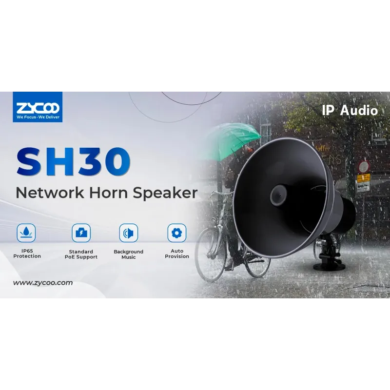 Overview | Zycoo SH30 Network Horn Speaker Network Speaker Built-in 30W amplifier SIP Protocol รองรับ POE พร้อม Amplifier 30Wในตัว Max Sound 117dB ระยะ 70เมตร SH30 Network Horn Speaker ลำโพง Horn ที่รองรับ SIP Protocol ประสิทธิภาพสูงสำหรับเผยแพร่การแจ้งเตือน และการสตรีมการเล่นเพลงที่มีความคมชัดสูง SH30 มีความไวและความจุสูง ให้ความอิ่มตัวที่ชัดเจนและสมบูรณ์ ไม่ว่าจะใช้ SIP ก็ตามการแพร่โฆษณาหรือการเล่นเพลงประกอบ ด้วยเอาต์พุตและอินพุตสัญญาณสวิตช์สำหรับการรวมเซ็นเซอร์ต่างๆ |