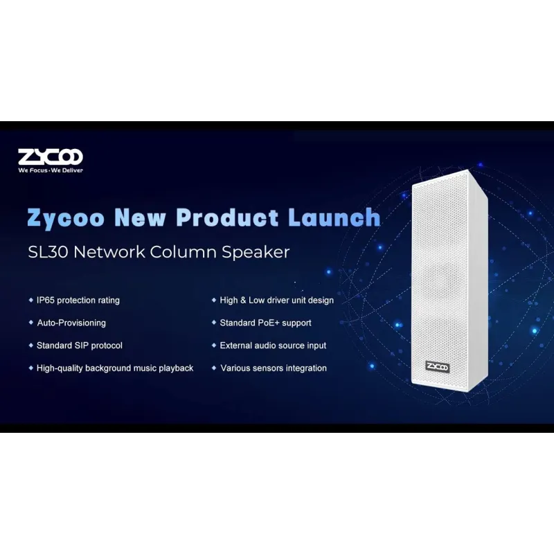 Overview | Zycoo SL30 Network Column Speaker (SMALL) Network Speaker ลำโพงคอลัมน์ผ่าน SIP Protocol พร้อม Amplifier ในตัว Max Sound 97dB ระยะ 50เมตร รองรับ POE SL30 Network Column Speaker ลำโพงคอลัมน์ที่รองรับ SIP Protocol ประสิทธิภาพสูงสำหรับเผยแพร่การแจ้งเตือน และการสตรีมการเล่นเพลงที่มีความคมชัดสูง SL30 มีความไวและความจุสูง ให้ความอิ่มตัวที่ชัดเจนและสมบูรณ์ ไม่ว่าจะใช้ SIP ก็ตามการแพร่โฆษณาหรือการเล่นเพลงประกอบ ด้วยเอาต์พุตและอินพุตสัญญาณสวิตช์สำหรับการรวมเซ็นเซอร์ต่างๆ รองรับการจ่ายไฟผ่านสาย LAN (PoE+) ทำให้การติดตั้งง่ายขึ้นมากและไม่เปลืองแรง |