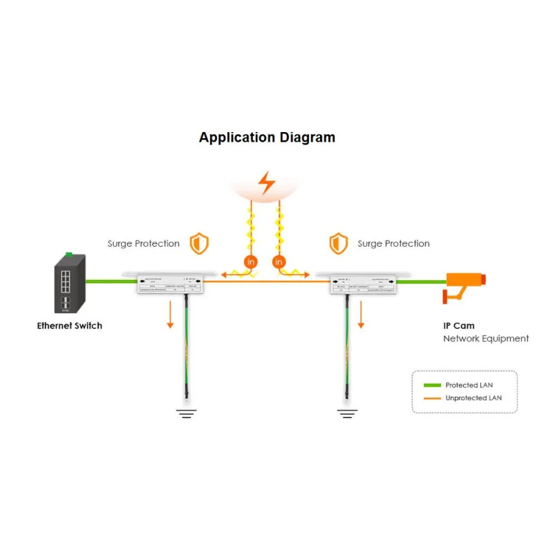 The SURGEPRO-GE is designed to provide protection networking devices, supporting PoE standards of IEEE 802.3af/at/bt and network speeds of 10 Mbps, 100 Mbps, and 1 Gbps for connections up to 100 meters.