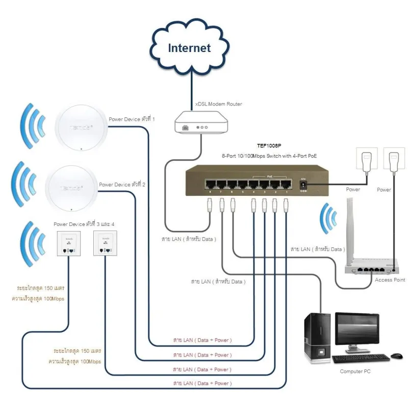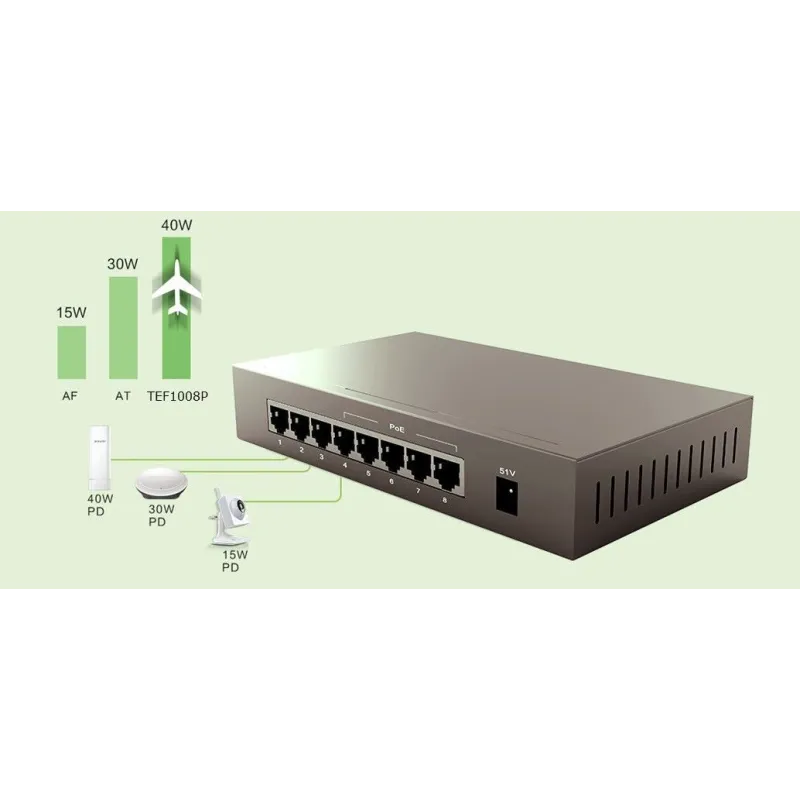 | พอร์ตการเชื่อมต่อ | 8*10/100Mbps auto-negotiation ports Port1 - Port4 support IEEE802.3 at/af standard |
