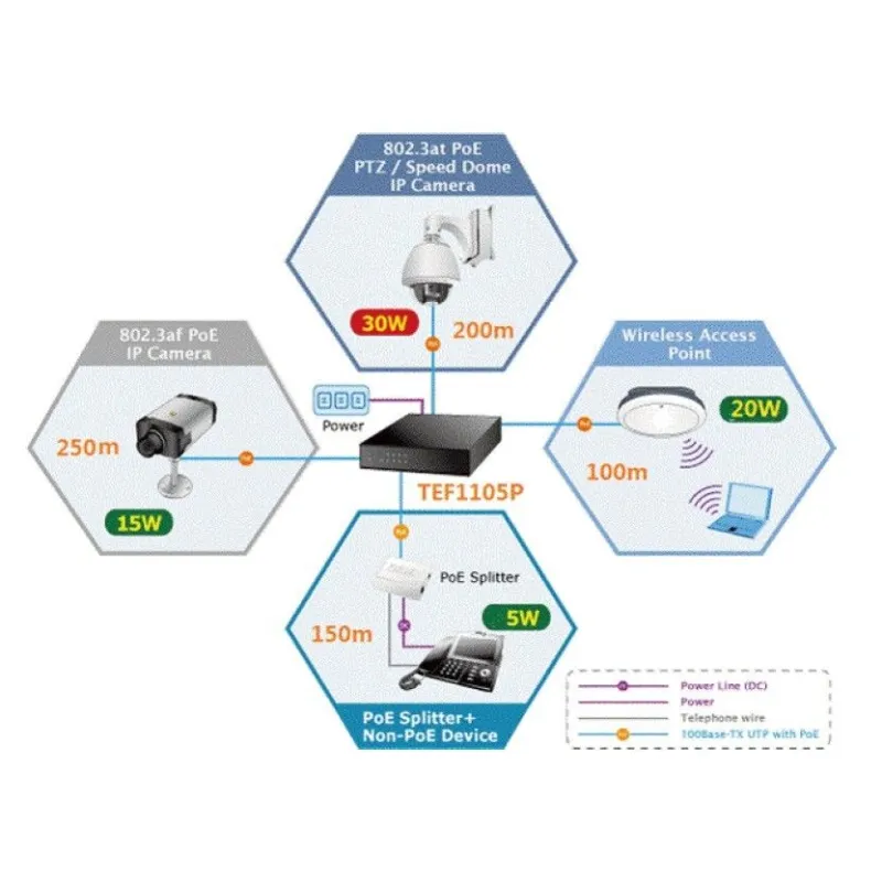 Interface | 5 Port ความเร็ว 10/100Mbps auto-negotiation ports, port1~4 support IEEE802.3 at/af standard |