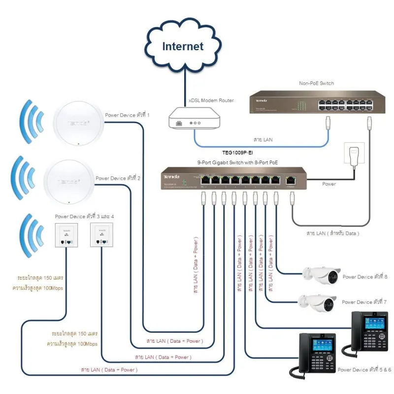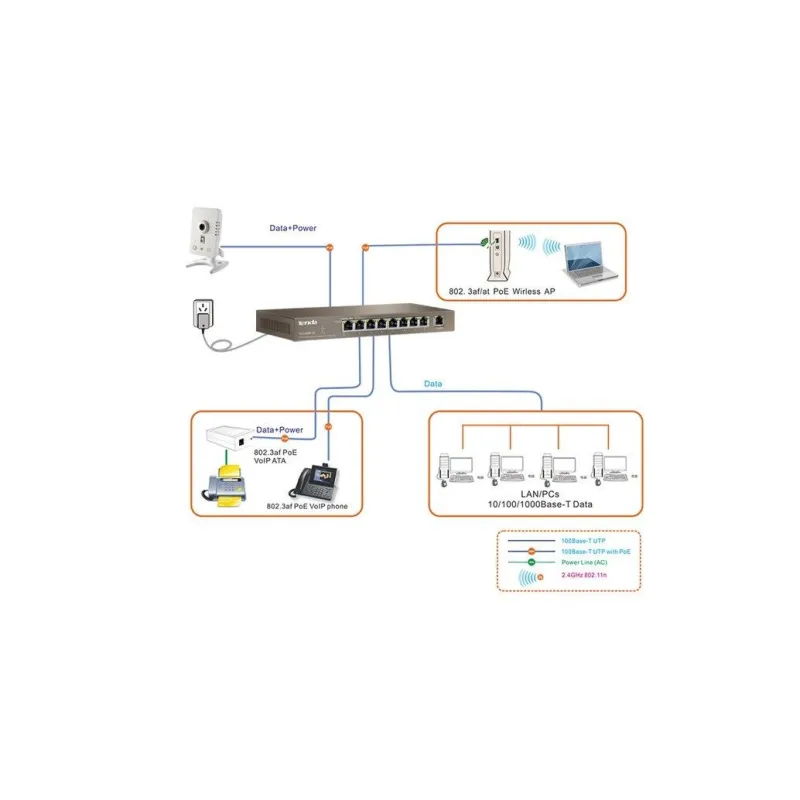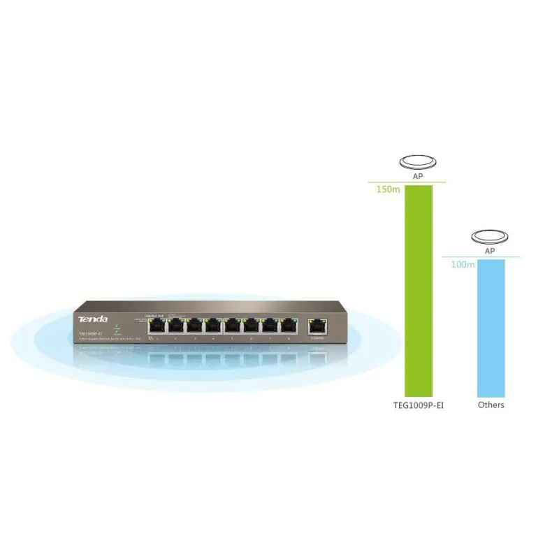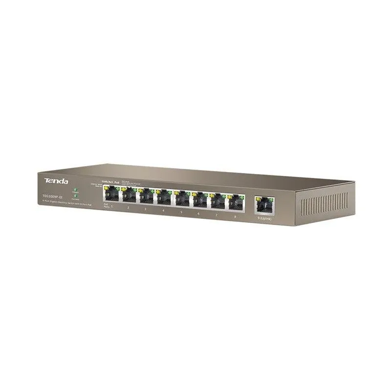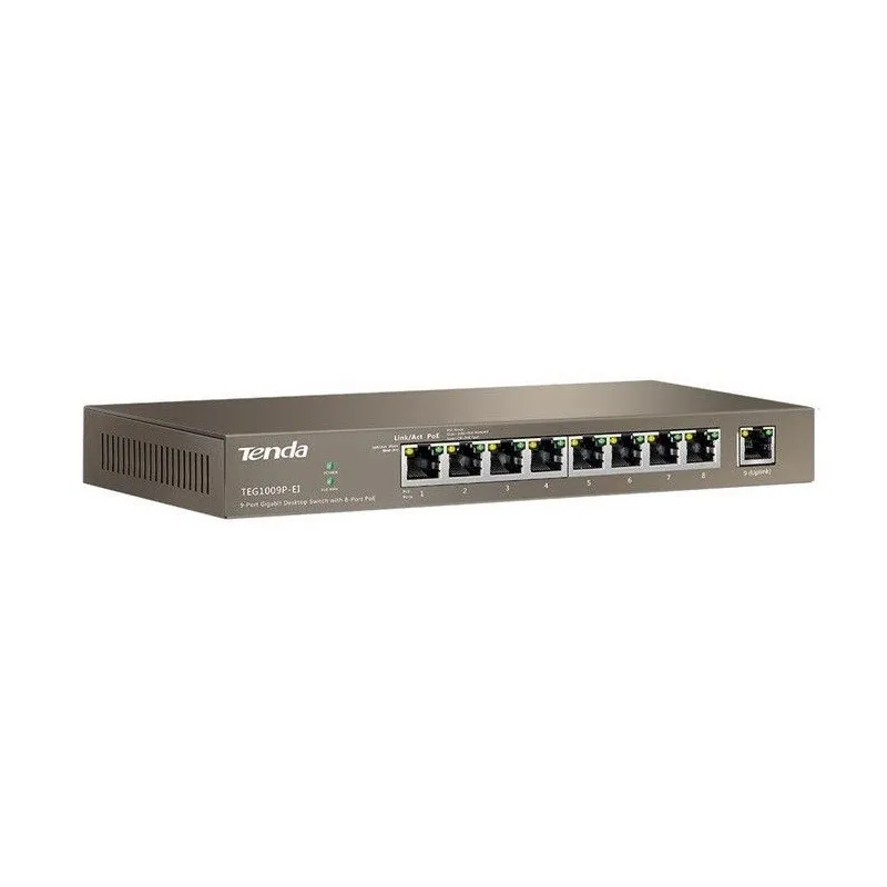 Overview | TENDA TEG1009P-EI อุปกรณ์ Gigabit POE Switch ขนาด 9 Port ความเร็ว Gigabit 10/100/1000Mbps แบบ Desktop จ่ายไฟ POE มาตรฐาน 802.3af จำนวน 8 Port จ่ายไฟสูงสุด 15.4W ต่อ Port, มาตรฐาน 802.3at จำนวน 4 Port จ่ายไฟสูงสุด 30W ต่อ Port รวมกำลังไฟสูงสุด 121.2W |