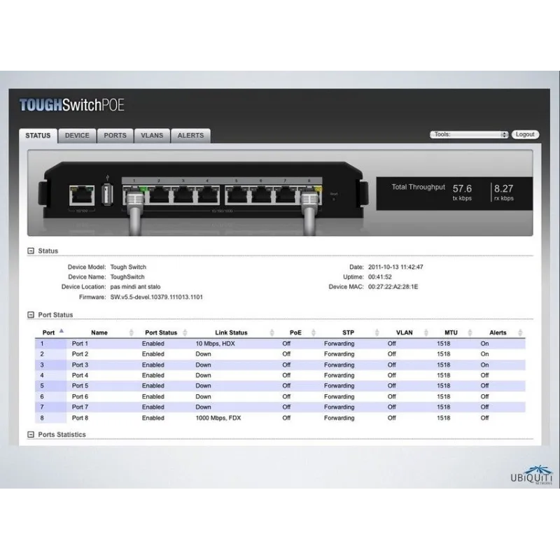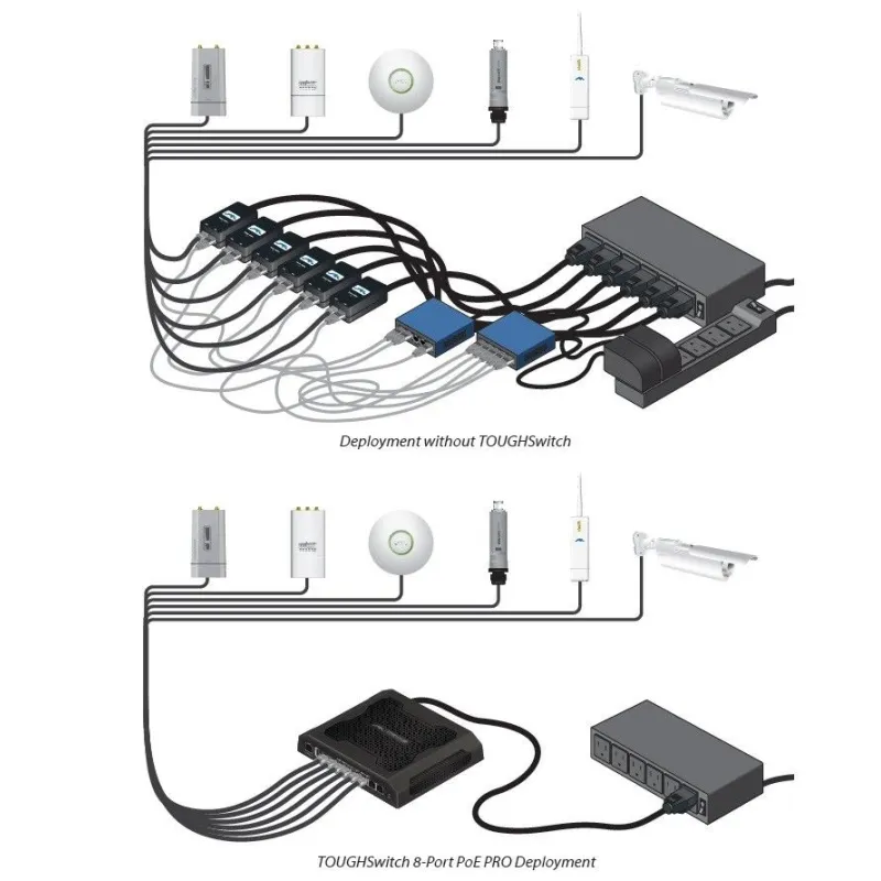 อุปกรณ์ Ubiquiti TOUGHSwitch PoE Pro ความเร็ว Gigabit จ่ายไฟผ่านสาย Lan 24VDC และ 48VDC ได้สูงสุด 18W ต่อ Port ใช้งานร่วมกับอุปกรณ์ Ubiquiti, Deliberant (ไม่ใช่มาตรฐาน 802.3af) รองรับการทำ VLan, STP/RSTP, Port Monitoring, Ping Watchdog