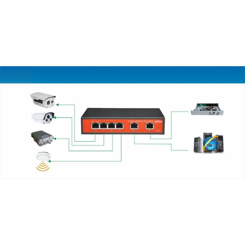 - 6 Port 100Mbps Ports with 4 PoE, 2 uplink Ports