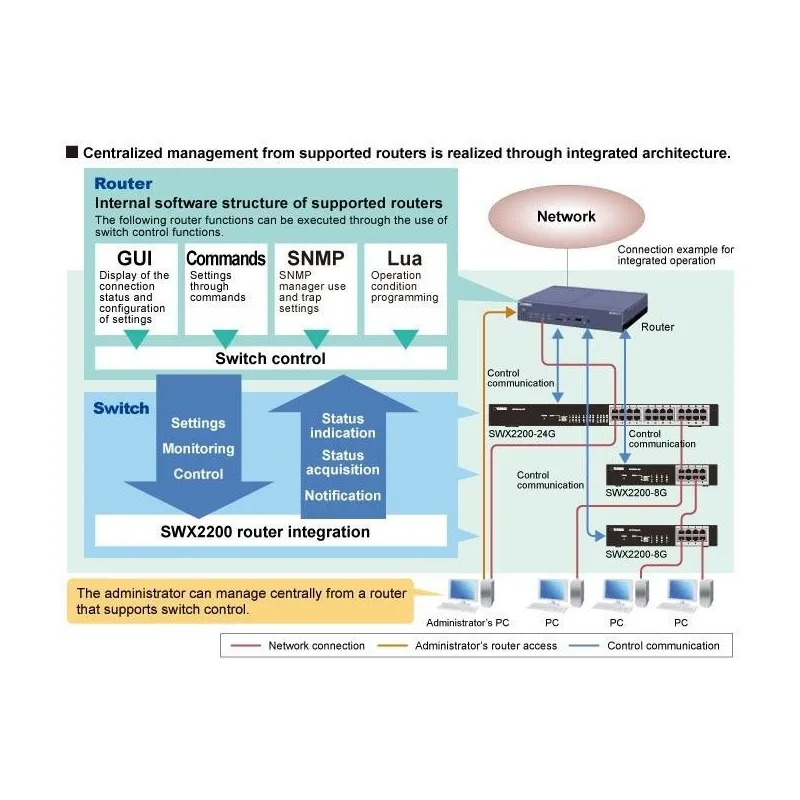 Switch control function (? 1) | Management auto configured from the router, management control from the GUI / command of routers, network configuration display, VLAN batch configuration, host search, via SNMP on the router |