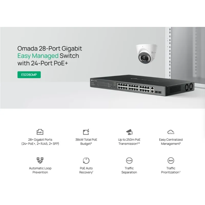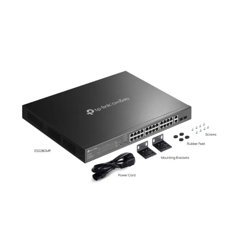 Omada by TP-LINK ES228GMP 24-Port Gigabit Easy Managed Switch 24-Port PoE+ Uplink 2 Port SFPและ 2 Port RJ45 , จ่ายไฟมาตรฐาน 802.3at สูงสุด 384W, รองรับ VLAN 802.1q, Port Mirroring, Loop Prevention, IGMP Snooping, PoE Auto Recoverry ,PoE Extend Mode ไกลสุด 250M