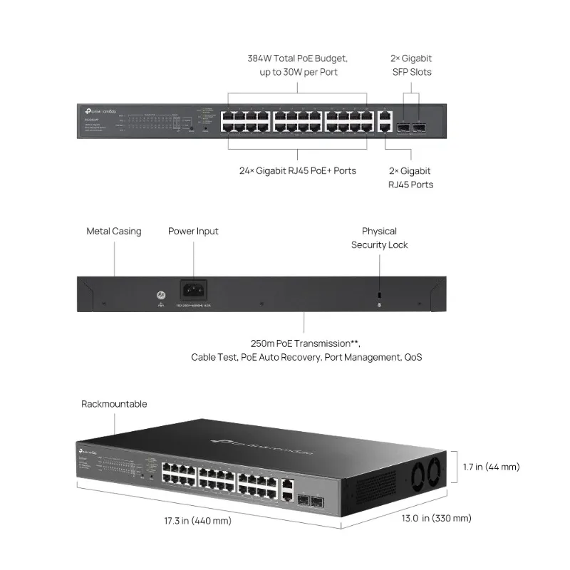 | Interface | • 24× 10/100/1000 Mbps PoE+ RJ45 Ports (support 802.3at PoE+ and 802.3af PoE) • 2× 10/100/1000 Mbps RJ45 Port • 2× Gigabit SFP/RJ45 Combo Port • Auto-Negotiation/Auto MDI/MDIX |