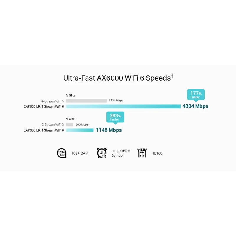 - Blazing-Fast WiFi 6 Speeds: Simultaneous 1148 Mbps on 2.4 GHz and 4804 Mbps on 5 GHz totals 5952 Mbps WiFi speeds.†